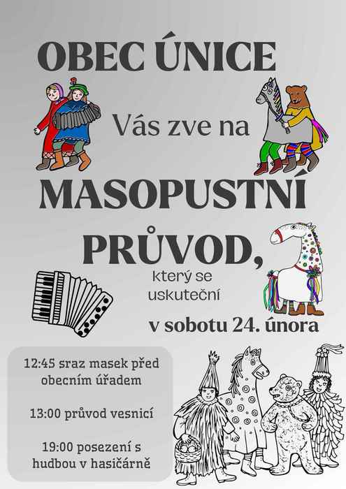 Obec Únice Vás zve na Masopustní průvod, který se uskuteční v sobotu 24. února.
