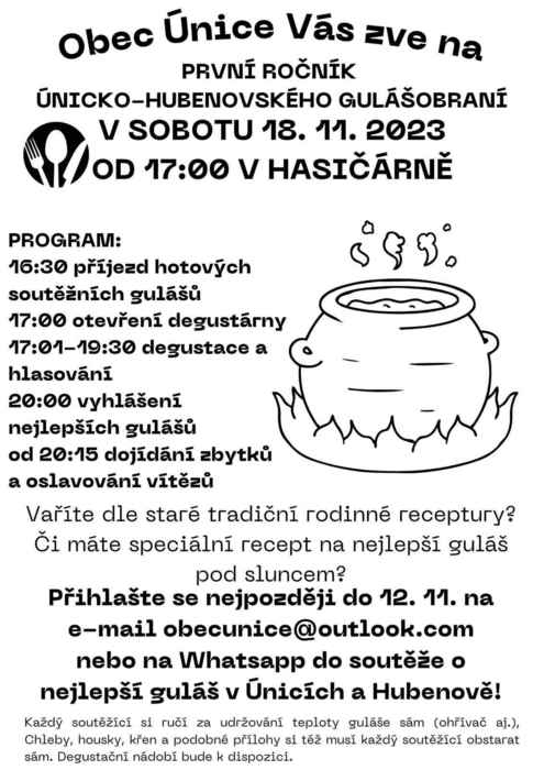 Přihlaste se nejpozději do 12. 11. na e-mail obecunice@outlook.com nebo na Whatsapp do soutěže o nejlepší guláš v Únicích a Hubenově!